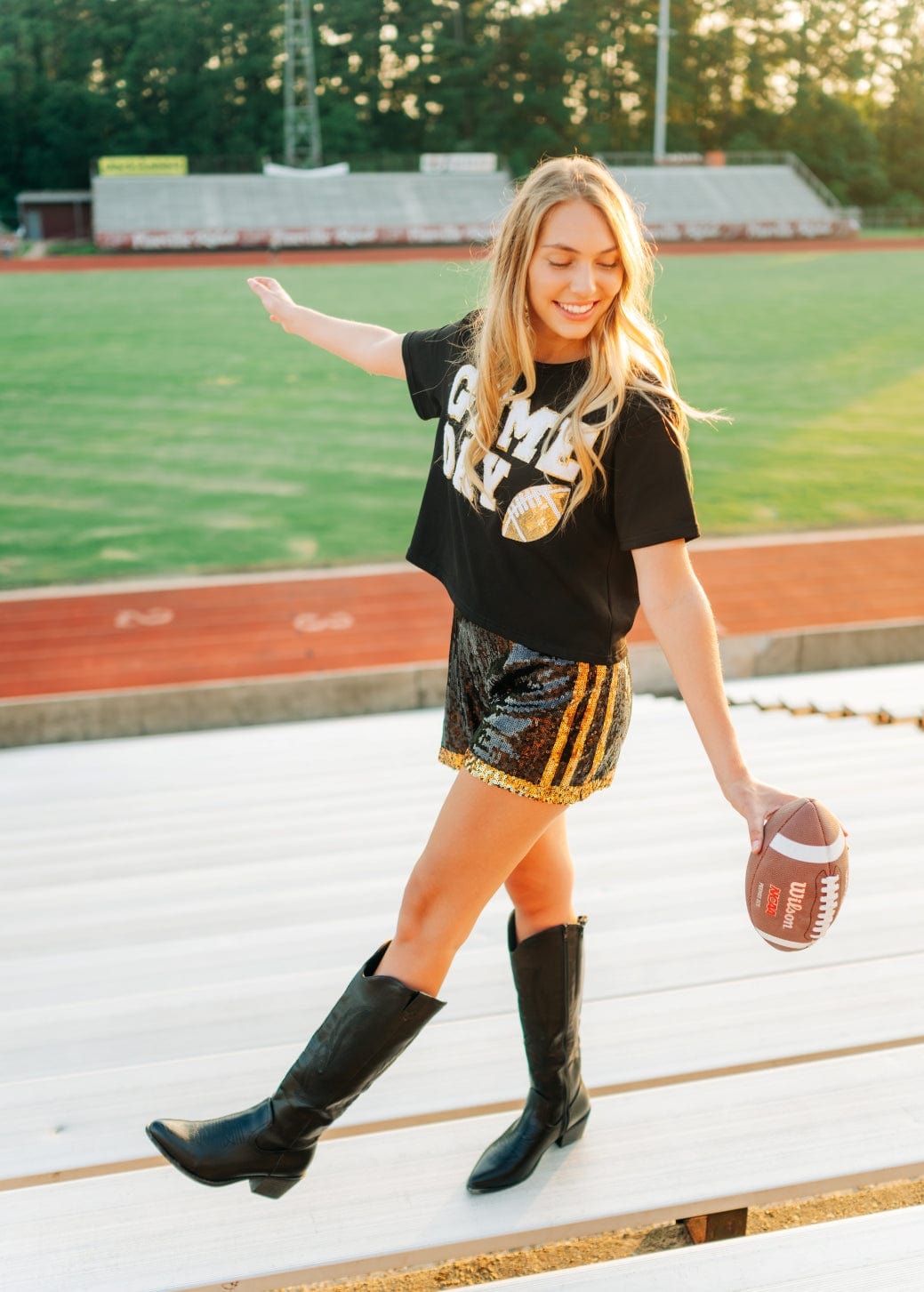 Show your team spirit in our Black Gameday Football Patch Top! This versatile piece features eye-catching Gameday embroidery and a distinctive Saints football patch. The rounded neckline and short sleeves create a flattering silhouette. while the stretchy fabric ensures all-day comfort with a relaxed fit that moves with you. Perfect for cheering on your team or casual weekend wear!