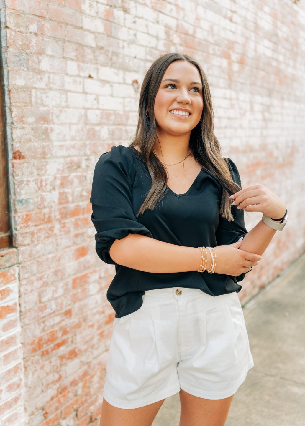 Elevate your wardrobe with our stunning Black V-Neck Balloon Sleeve Blouse. This airy. relaxed-fit top features elegant balloon sleeves that end mid-arm for the perfect balance of drama and practicality. The flattering V-neckline frames your décolletage beautifully while the non-fitted silhouette ensures all-day comfort. Perfect for both professional settings and casual outings. this versatile blouse will quickly become your go-to piece for effortless style.