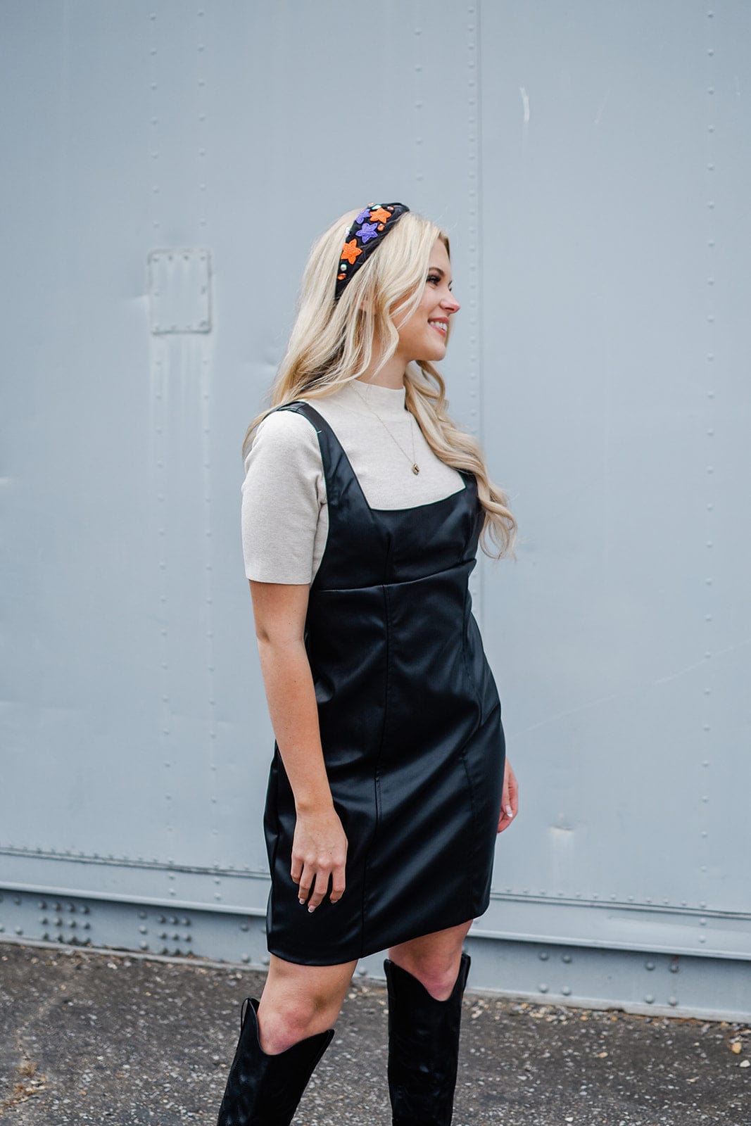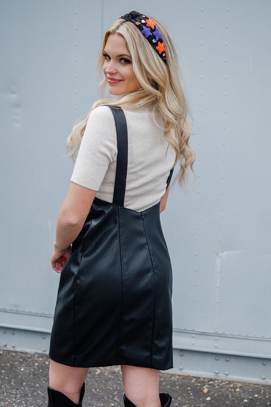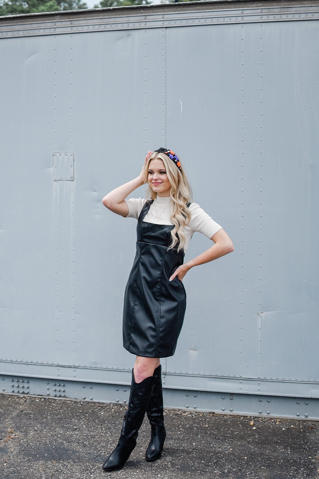 The Black Vegan Leather Mini Dress has a sleek and glossy finish that looks and feels like genuine leather. giving it a luxurious and edgy appeal. The square neckline and fitted bodice accentuates your curves. Tailored seams at the front and back create an hourglass silhouette.