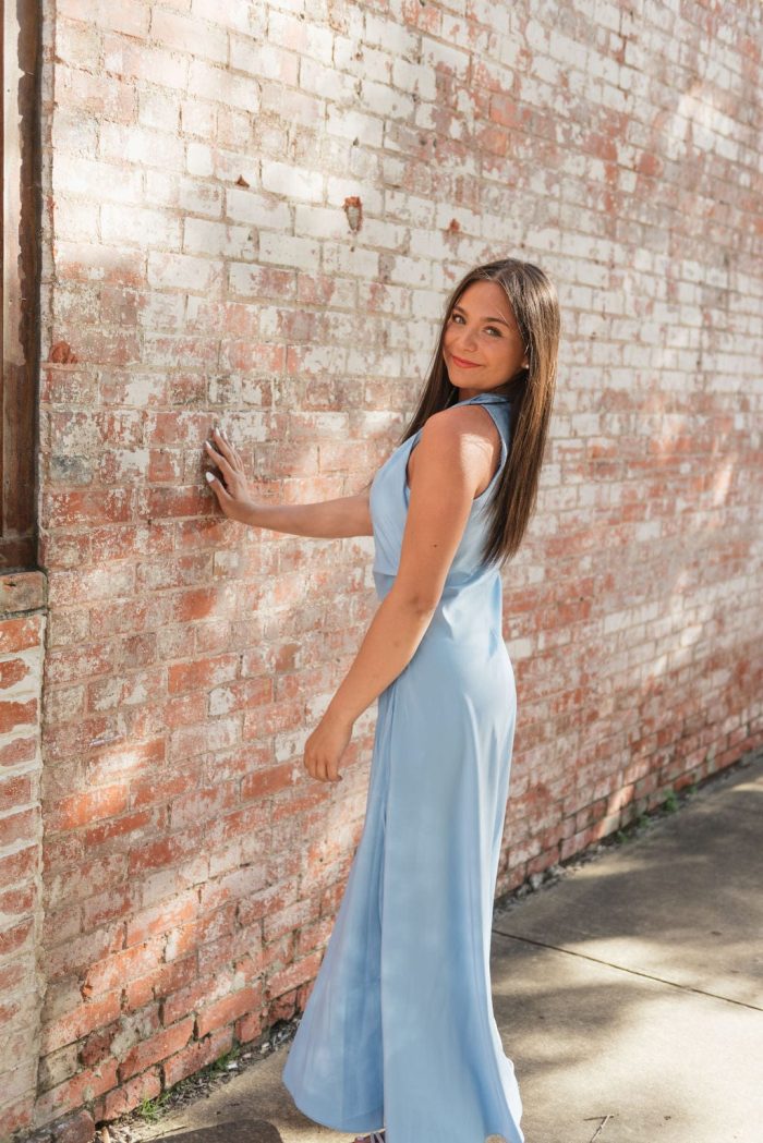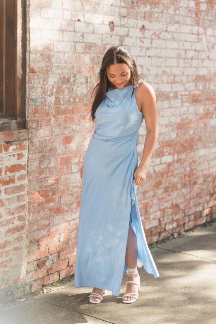 Elevate your style with our Blue Satin Draped Detail Midi Dress. The luxurious satin fabric and elegant cowl neckline exude sophistication. while the sleeveless design and draped detail add a touch of femininity. Perfect for Spring events and as a wedding guest. this dress will make you stand out.