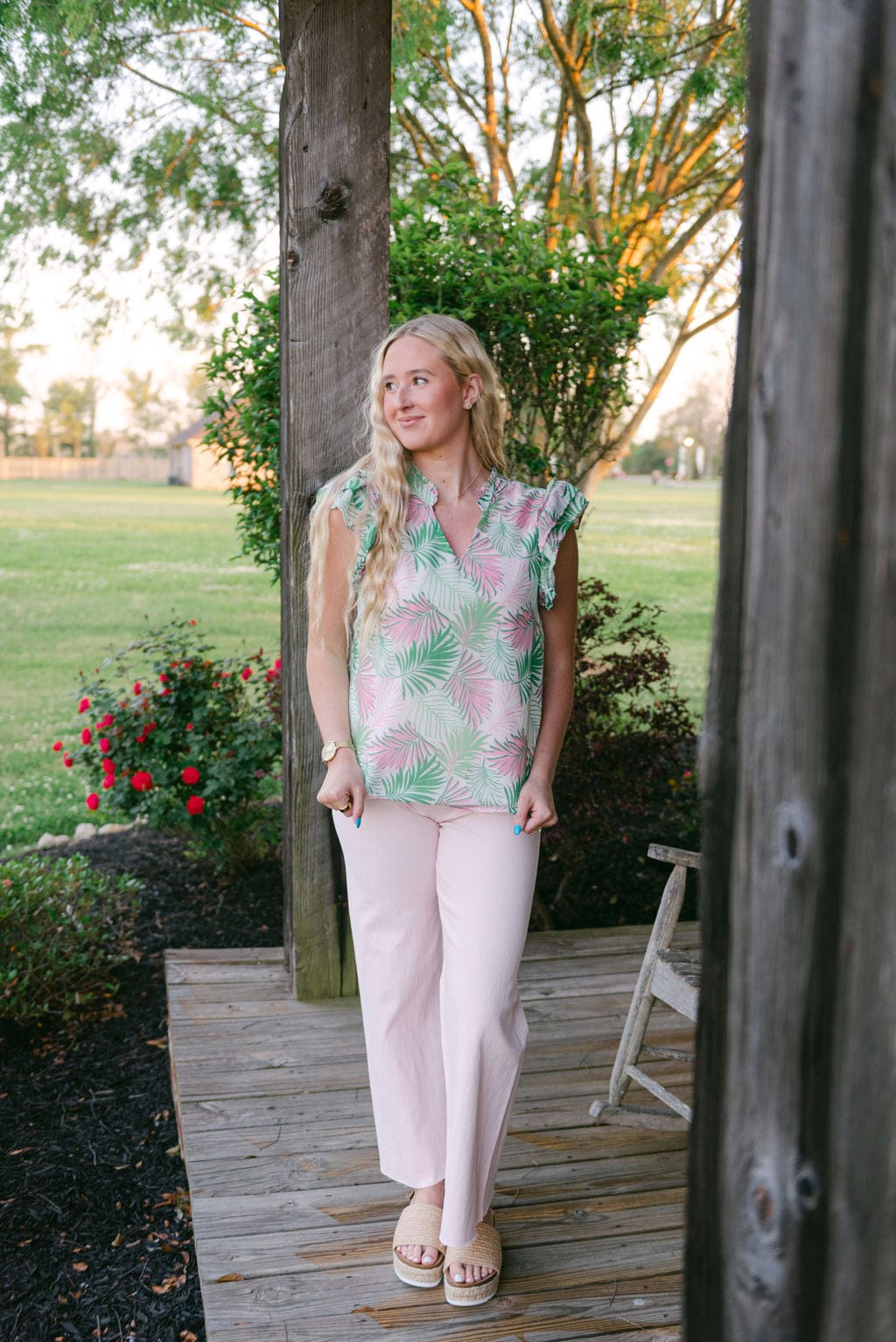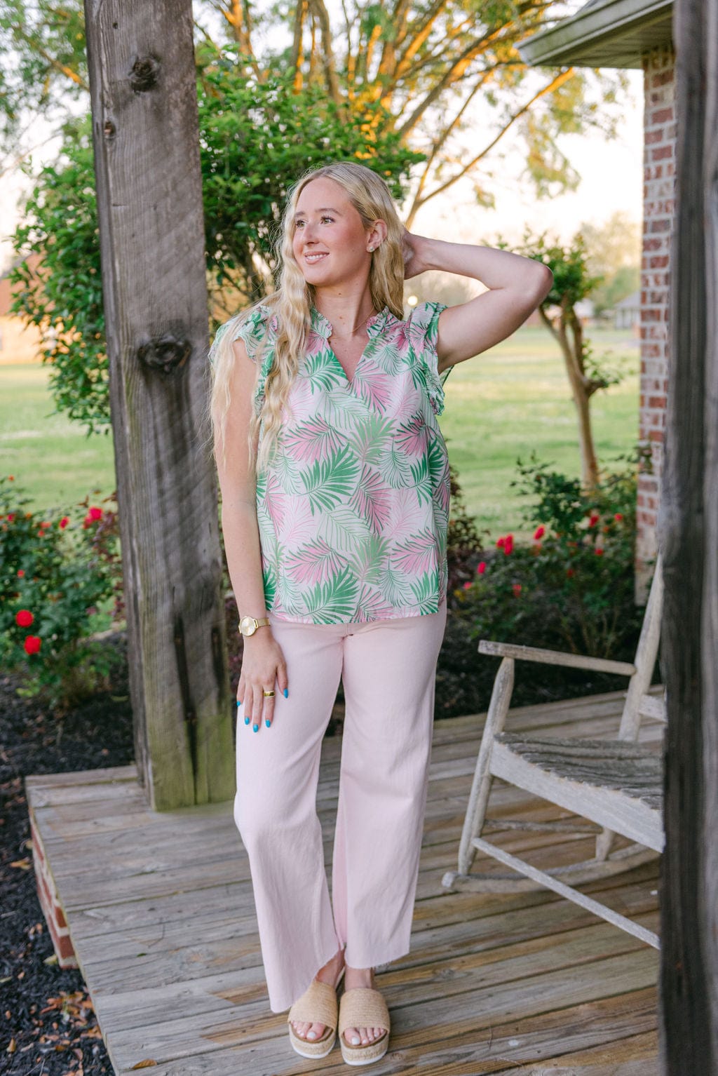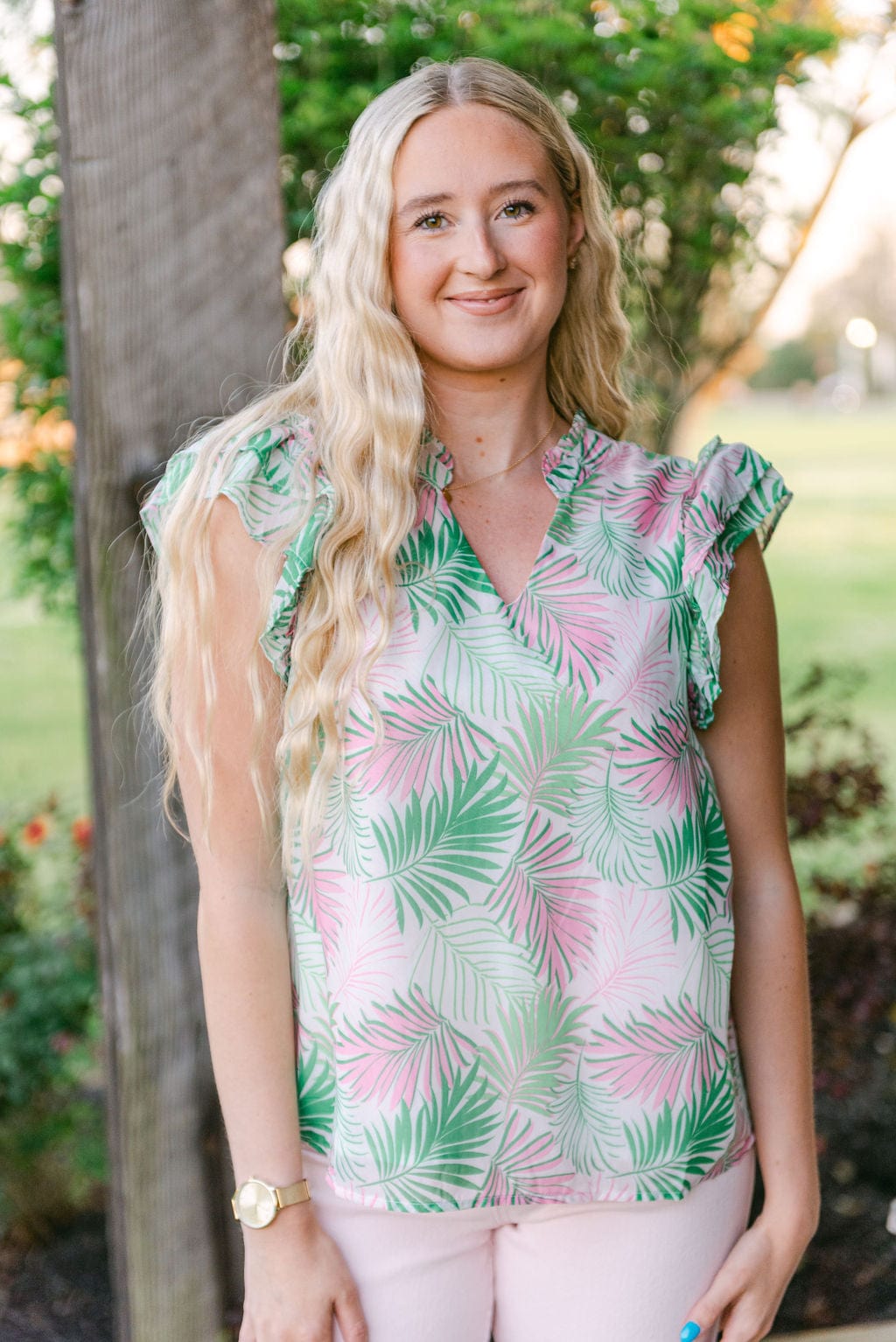 Elevate your style with the green Marley Tropical Leaves Top featuring a chic ruffle mock neck and charming ruffle cap sleeves. perfect for both casual outings and special occasions. This top is designed to impress. adding a touch of elegance to any outfit. Stay comfortable all day with its fully-lined construction.
