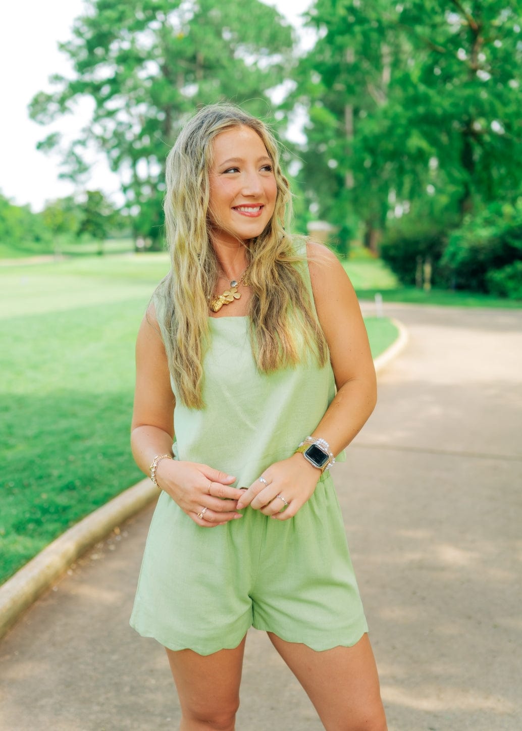Elevate your Spring wardrobe with our Kiwi Scallop Trim Short Set! An elastic waist and flowy shorts provide both comfort and style. while the square neckline and sleeveless design add a touch of elegance. The lightweight material and cropped hem make it perfect for warmer days. Don’t miss out on this must-have Spring set!