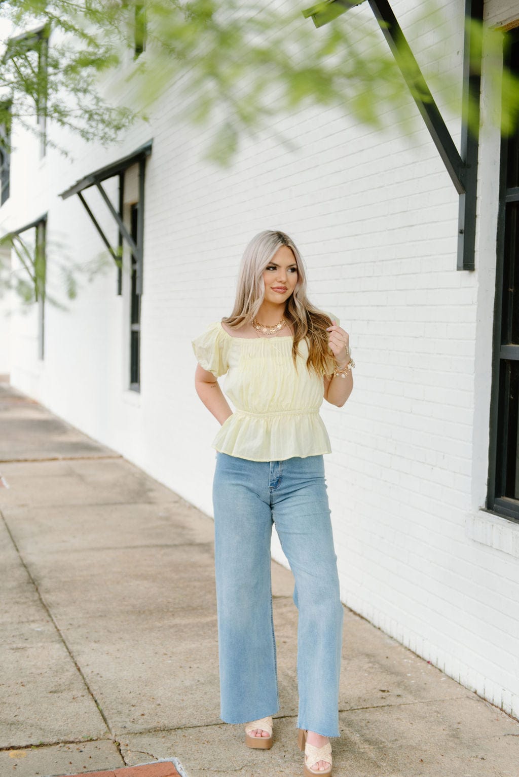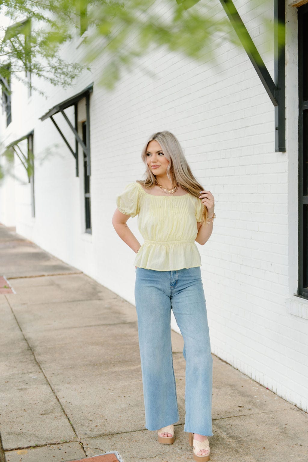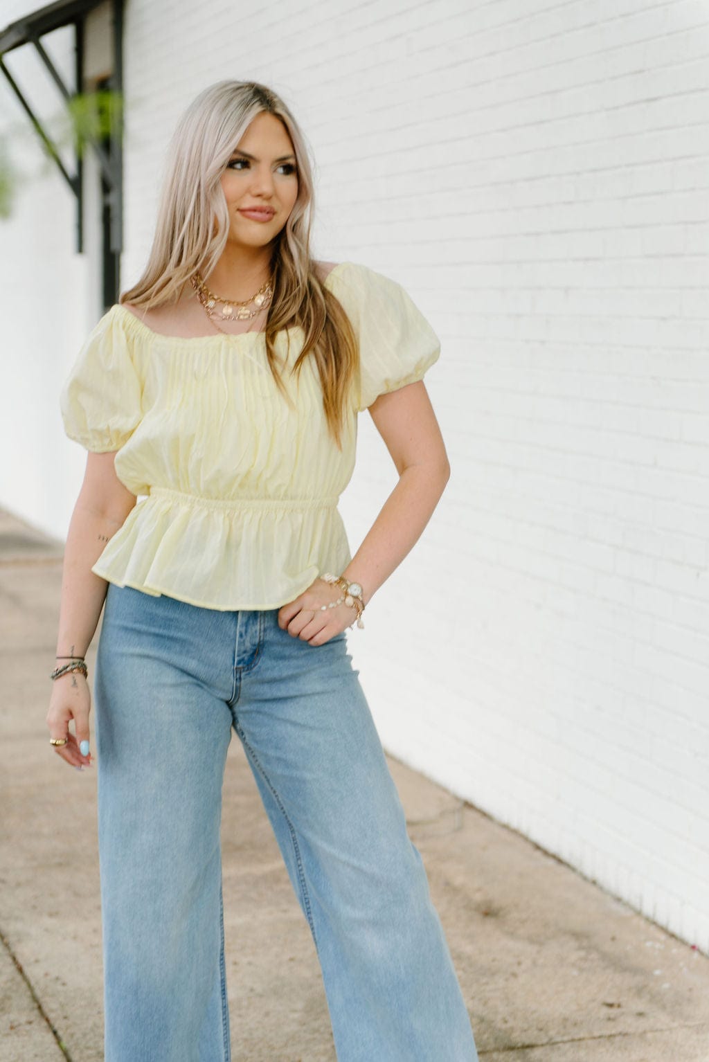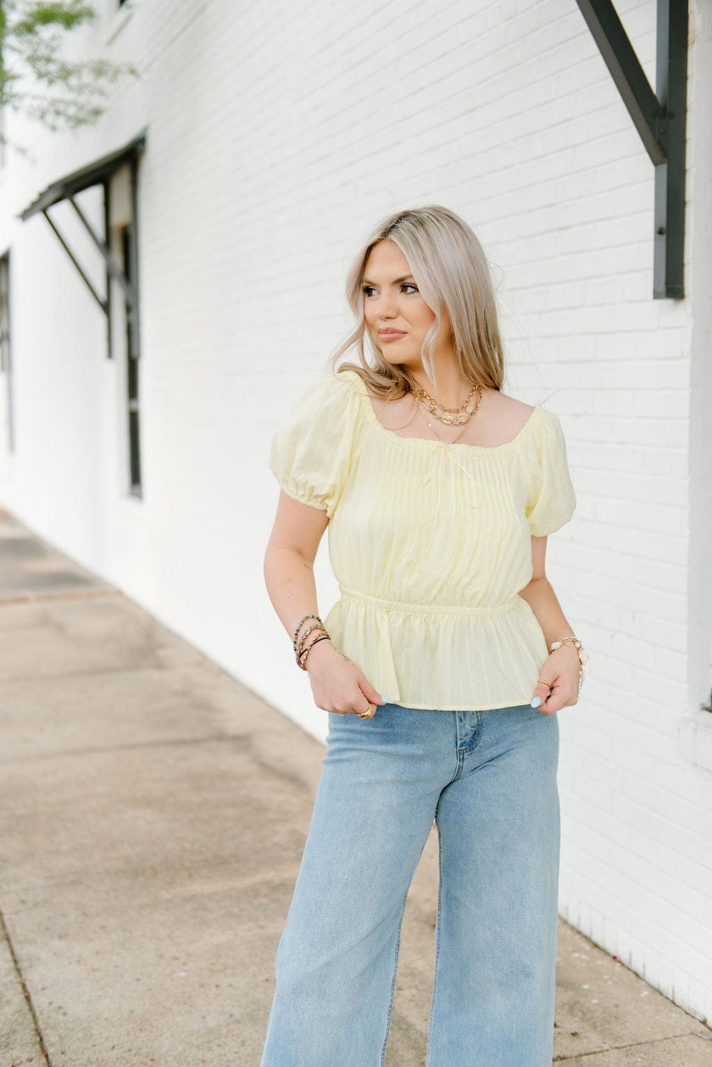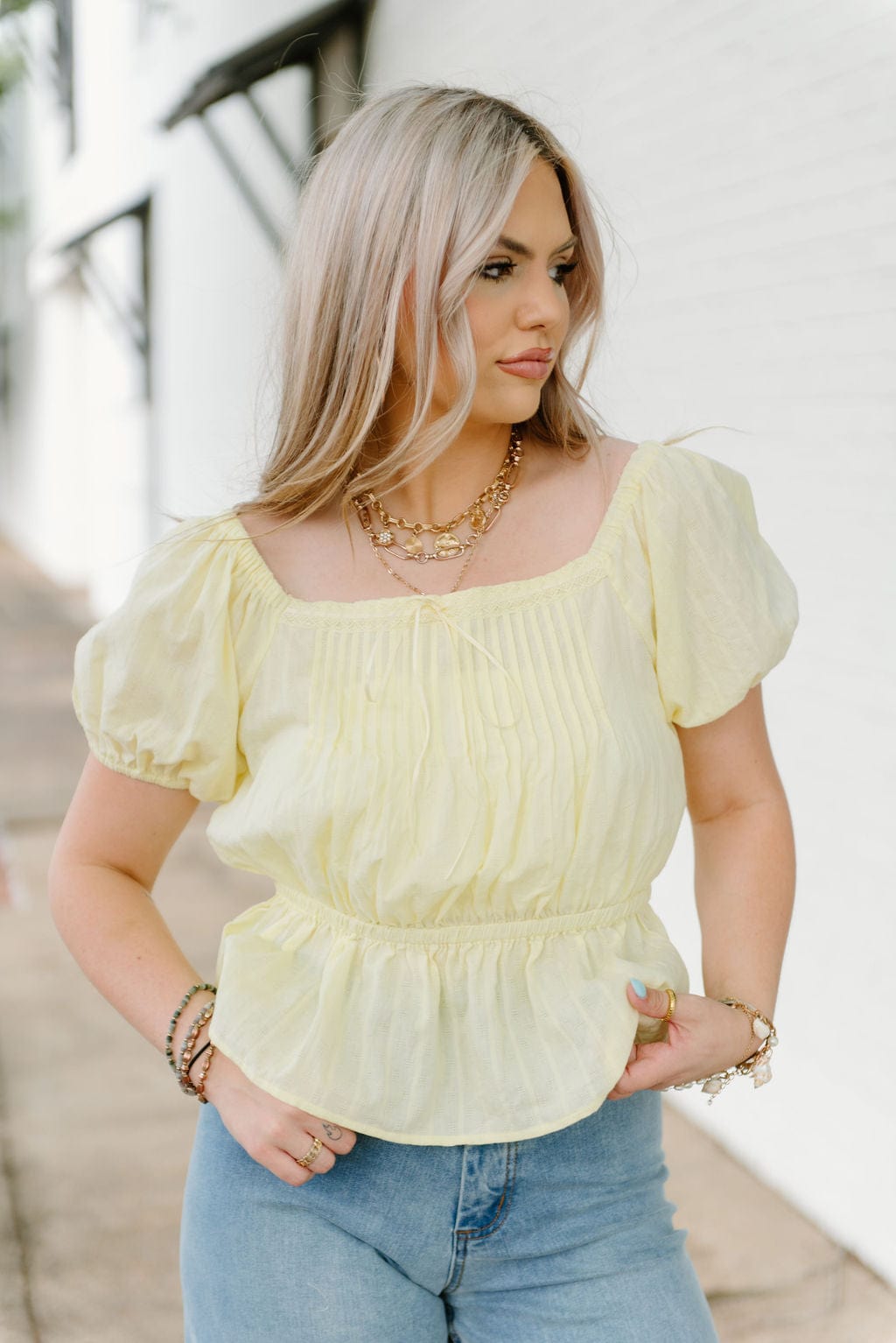 Introducing our Lemon Peplum Puff Sleeve Blouse! This vibrant yellow top features a flattering square neckline and short puff sleeves for a playful touch. The tie front and synched waist add shape to your figure. while the stretchy material ensures a comfortable fit. Perfect for Spring!