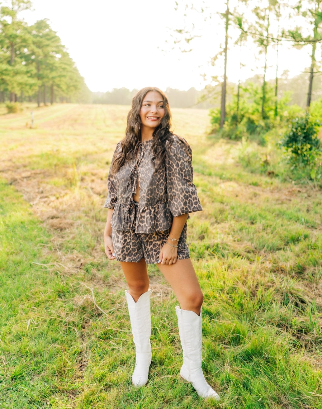 Unleash your fierce and fashionable side with our Leopard Tie Front Short Set! The leopard print. tie front top and flowy. high waisted shorts create a stylish and versatile ensemble perfect for any occasion. With short puff sleeves and an elastic waist. you’ll feel comfortable and confident all day long. Complete your look with this must-have set!