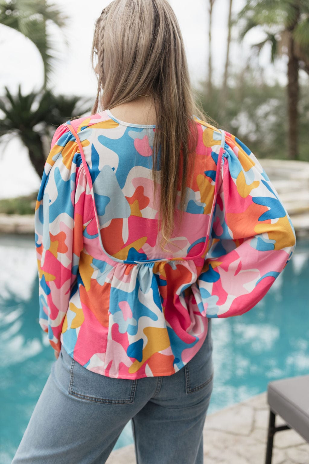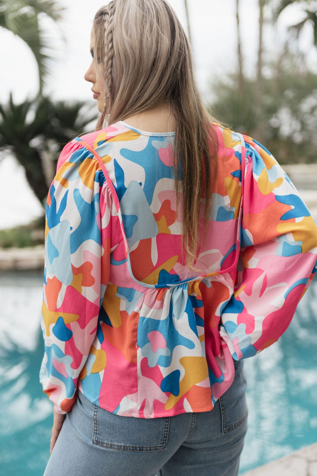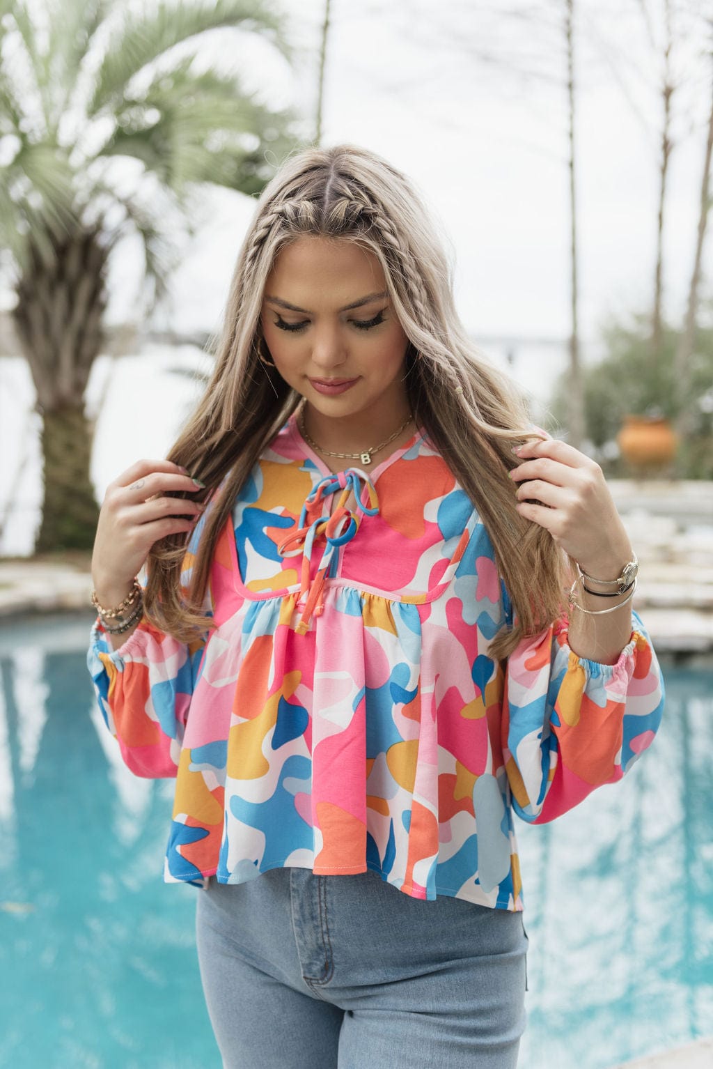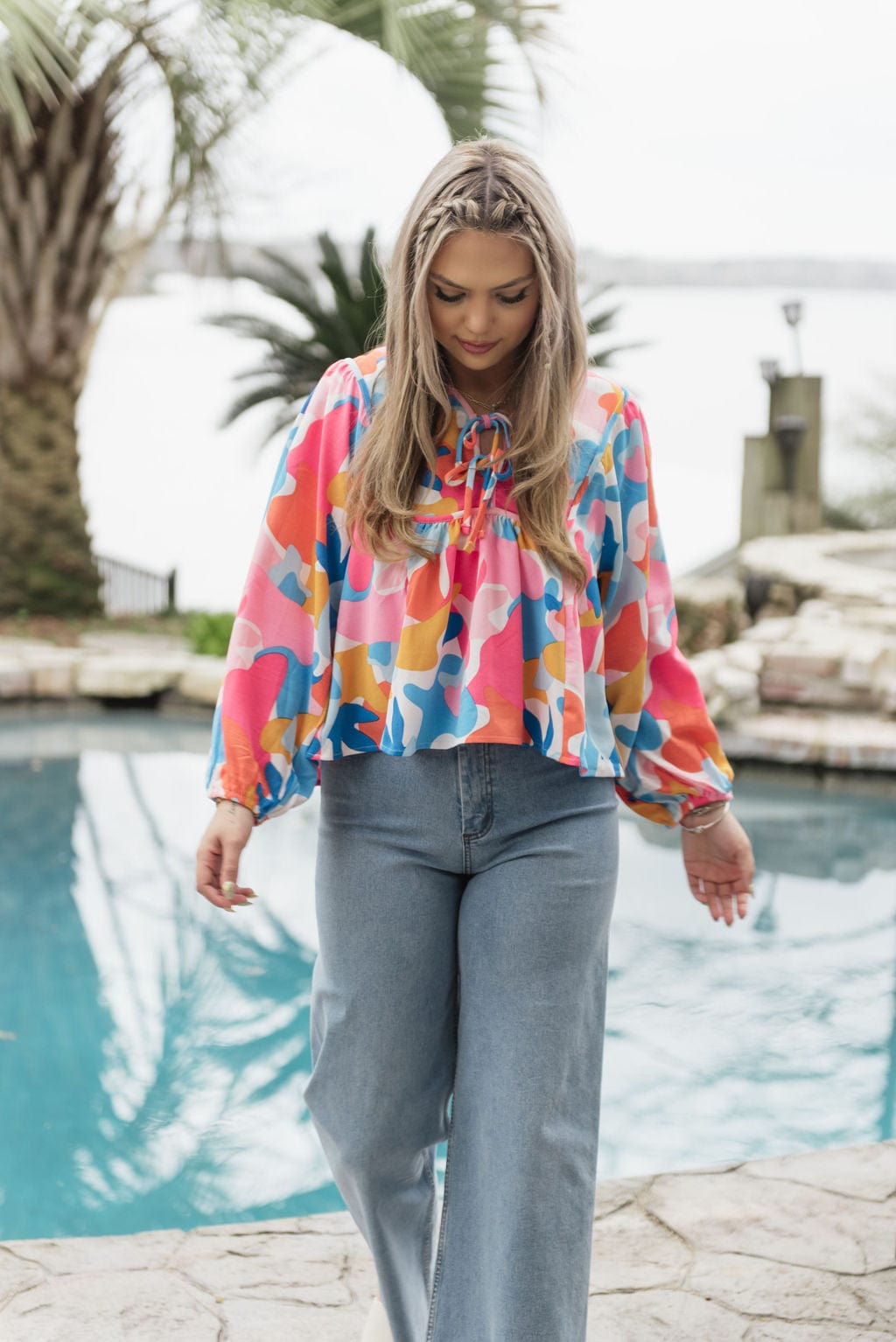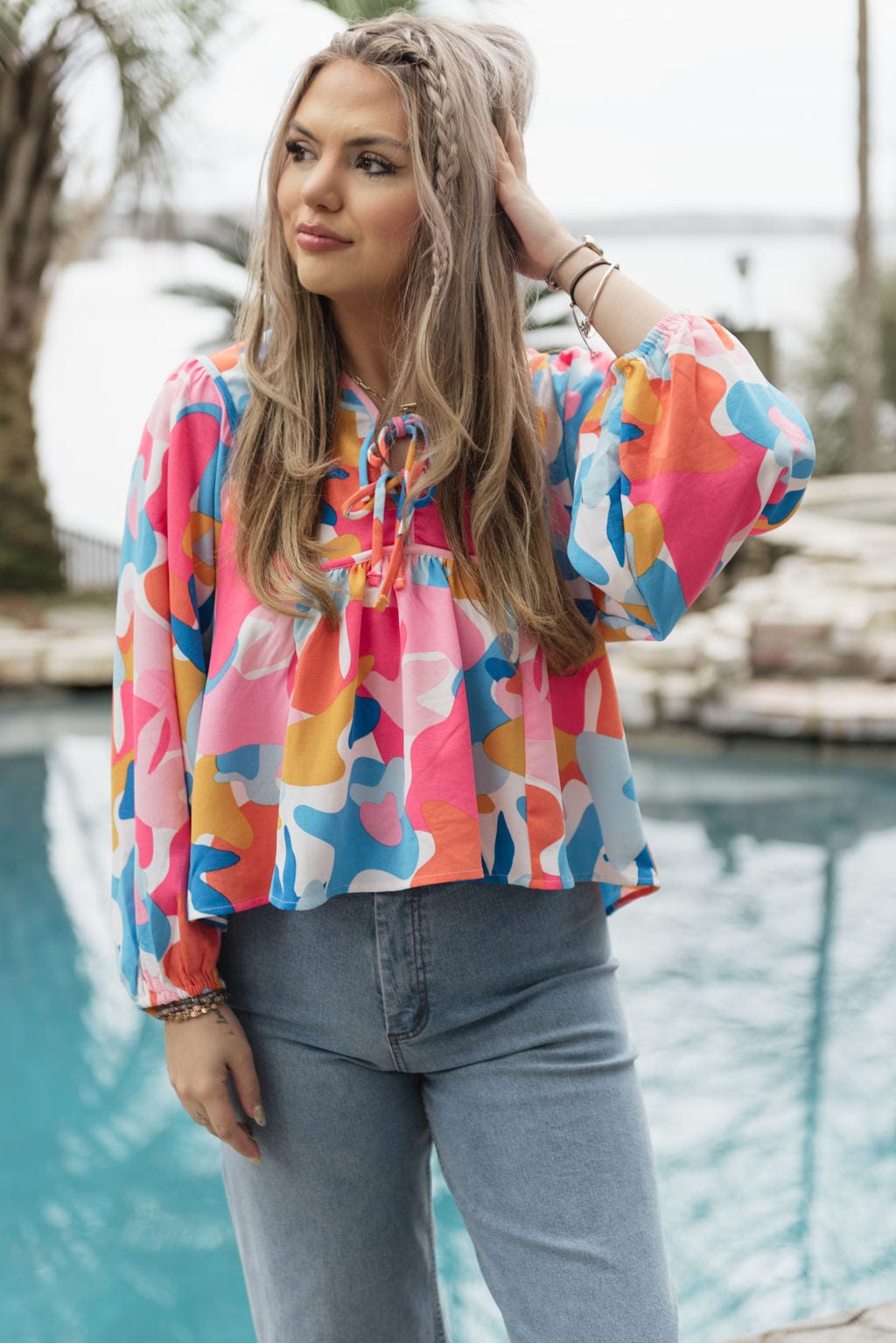 Elevate your Spring wardrobe with our Pink Vivey Hello There Top! This lightweight. flowy blouse features a beautiful multicolored print and a tie front detail. adding a touch of charm to any outfit. Its long puff sleeves and comfortable stretch make it perfect for any occasion. Make a statement with this must-have piece!