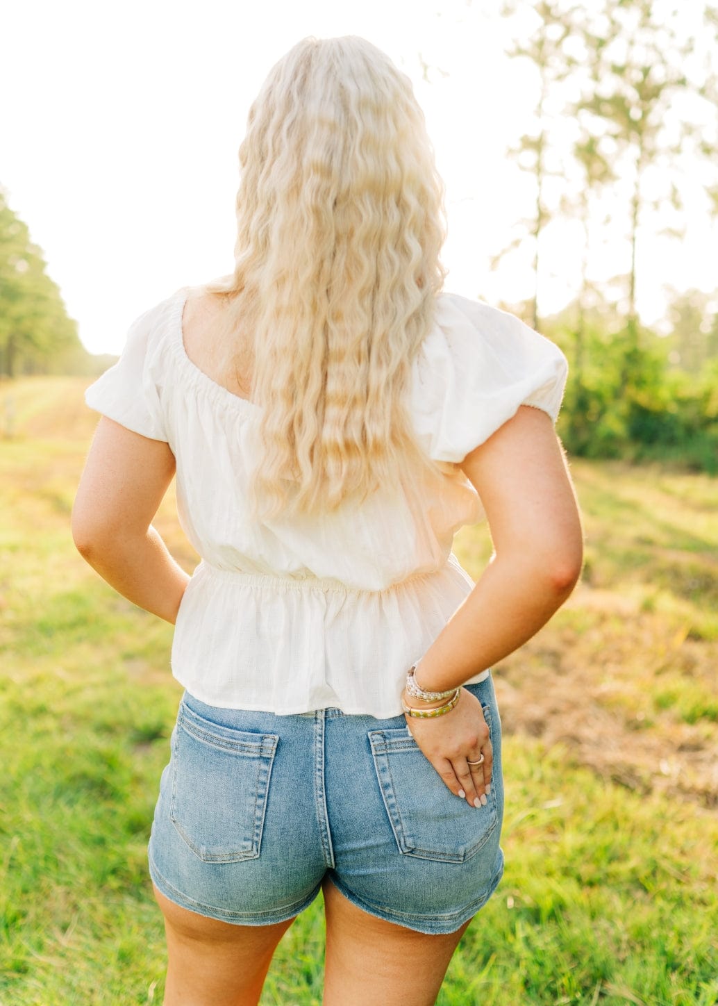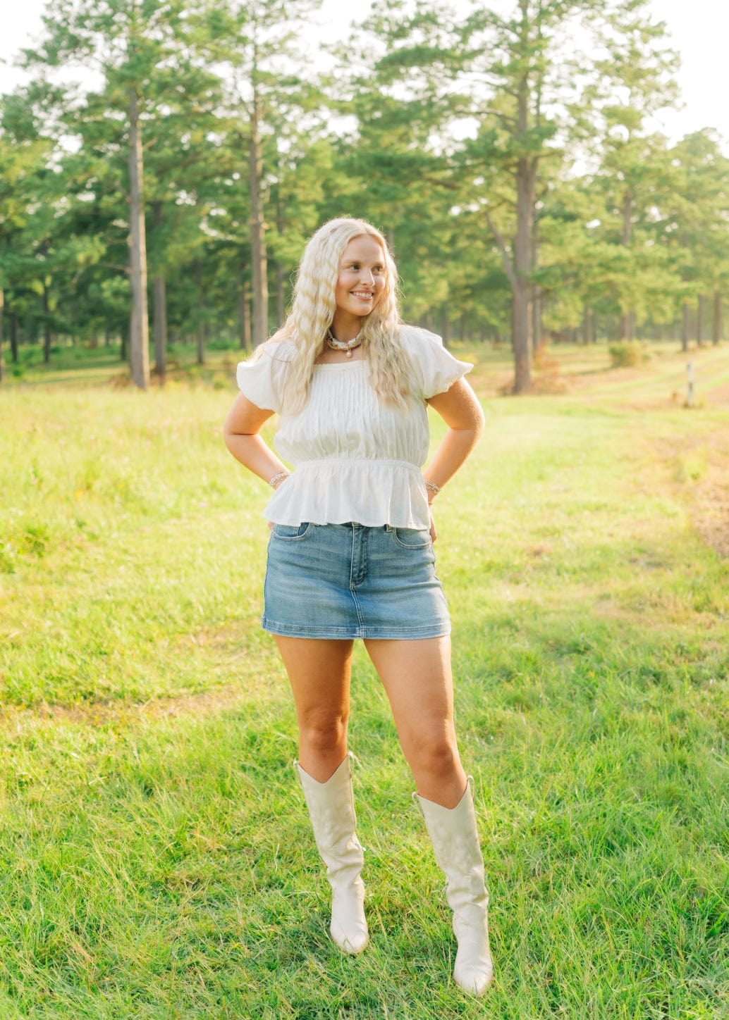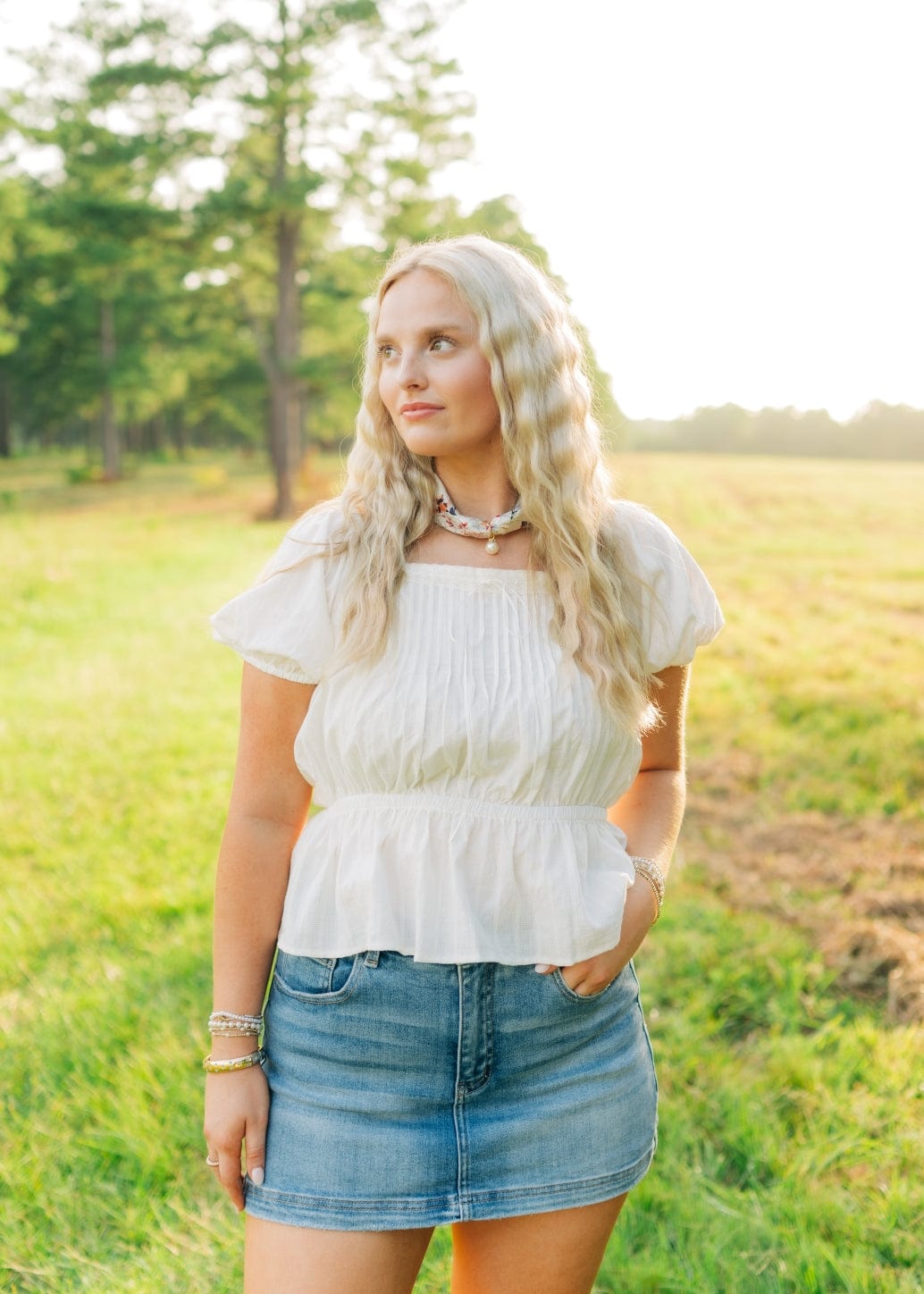 Elevate your Spring wardrobe with our White Peplum Puff Sleeve Blouse! Featuring a square neckline and tie front. this blouse adds a touch of femininity to any outfit. The short puff sleeves and synched waist provide a flattering silhouette. while the light weight fabric makes it perfect for warmer days.