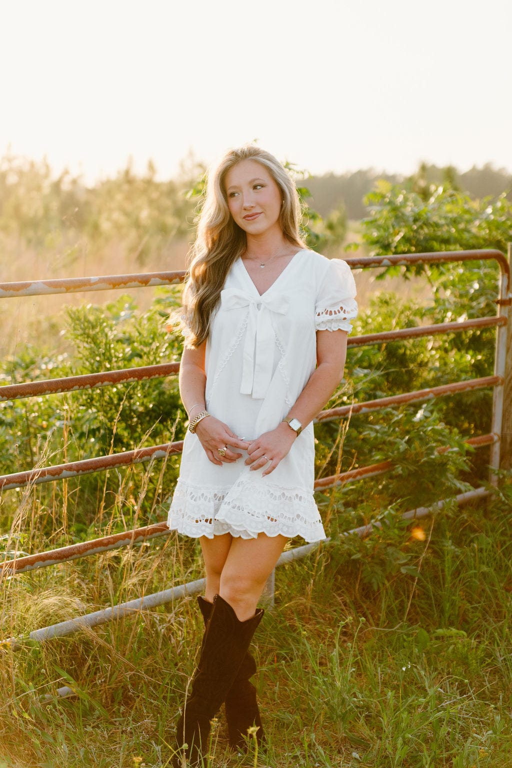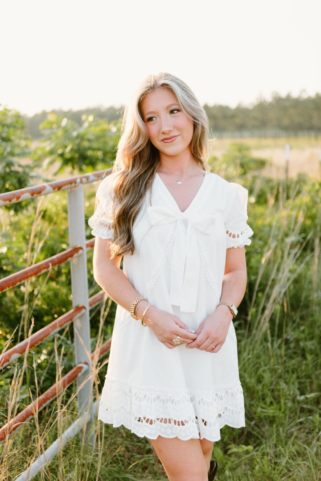White Eyelet Lace Bow Front Dress